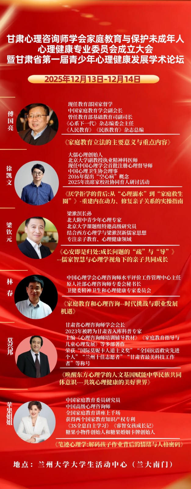 本网讯:冬日金城,群贤毕至。甘肃省心理咨询师学会 2025 年度学术年会暨第四届二次理事会、家庭教育与保护未成年人心理健康专业委员会成立大会,定于12月13日至14日在兰州大学学生活动中心隆重举办。本次盛会聚焦心理健康服务与家庭教育融合发展,广邀国内权威专家学者齐聚一堂,献上一场兼具学术深度与实践价值的思想盛宴。