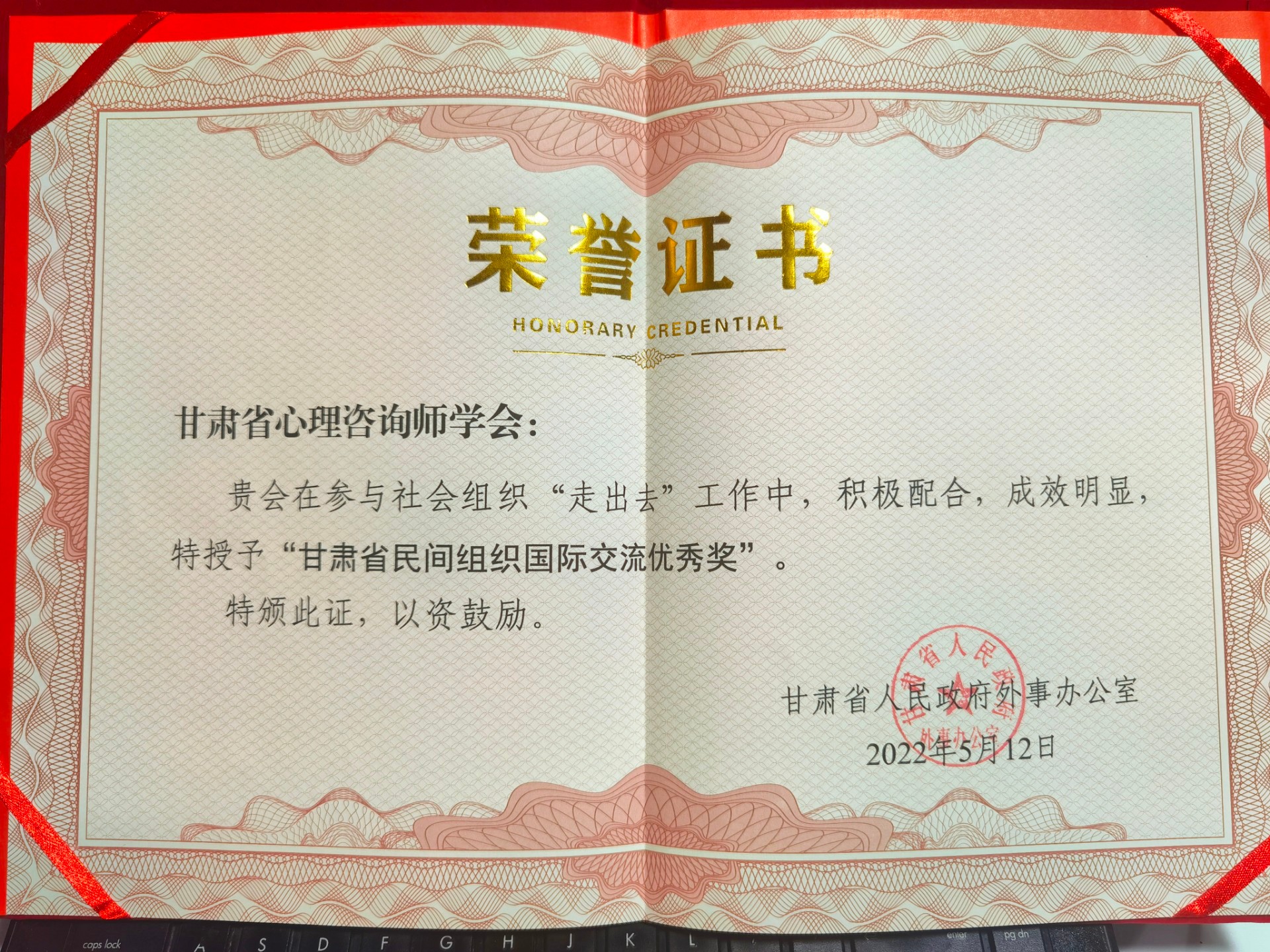 2022年5月12日,甘肃省心理咨询师学会被甘肃省人民政府外事办公室授予荣获“甘肃省民间组织国际交流优秀奖”