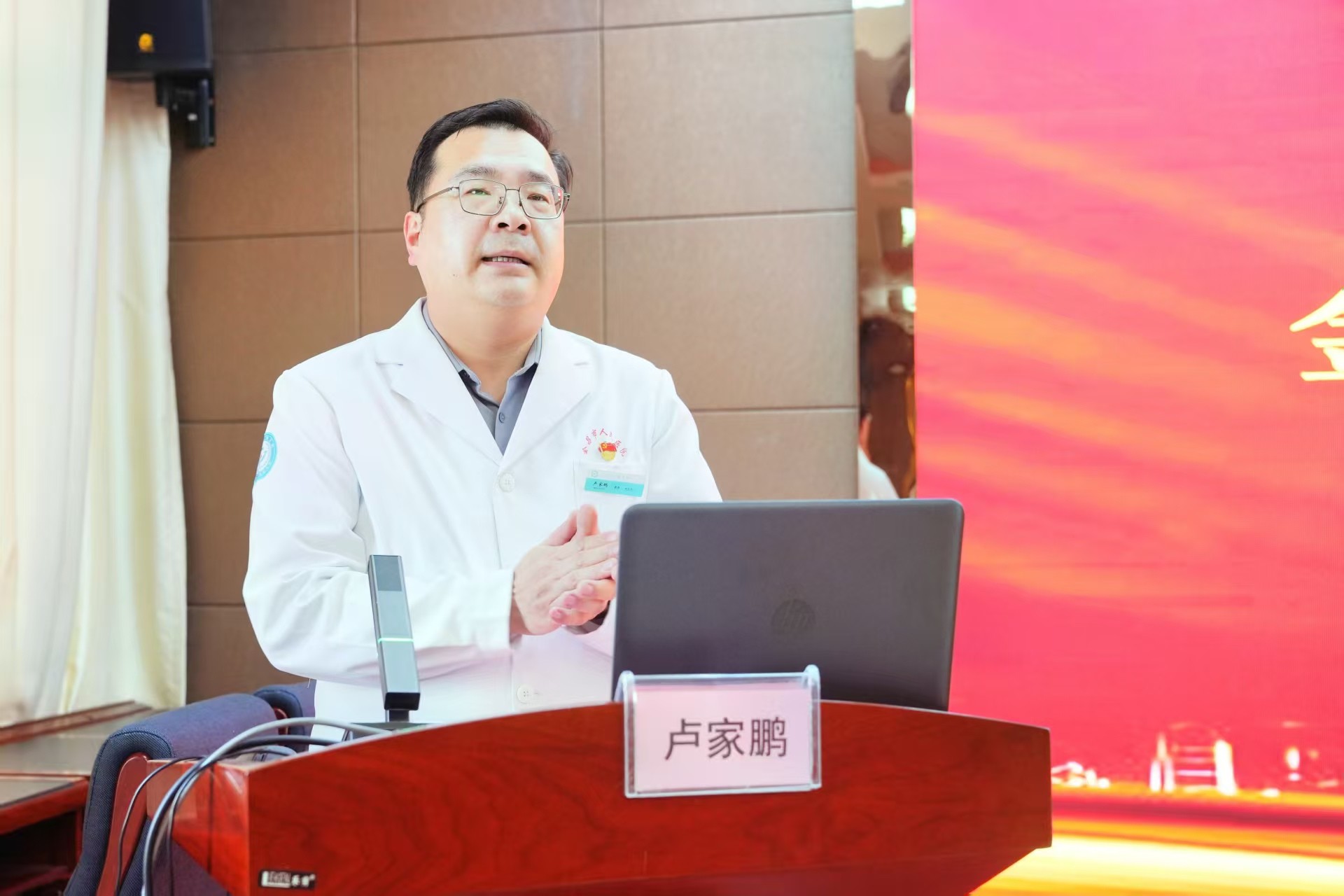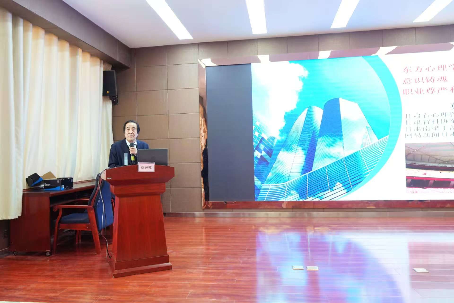 仪式现场,氛围庄重而热烈,甘肃省心理咨询师学会会长莫兴邦教授出席活动,并作题为《东方心理学赋能 共同体意识铸魂 提升医护人员职业尊严和幸福生活》的专题学术报告。